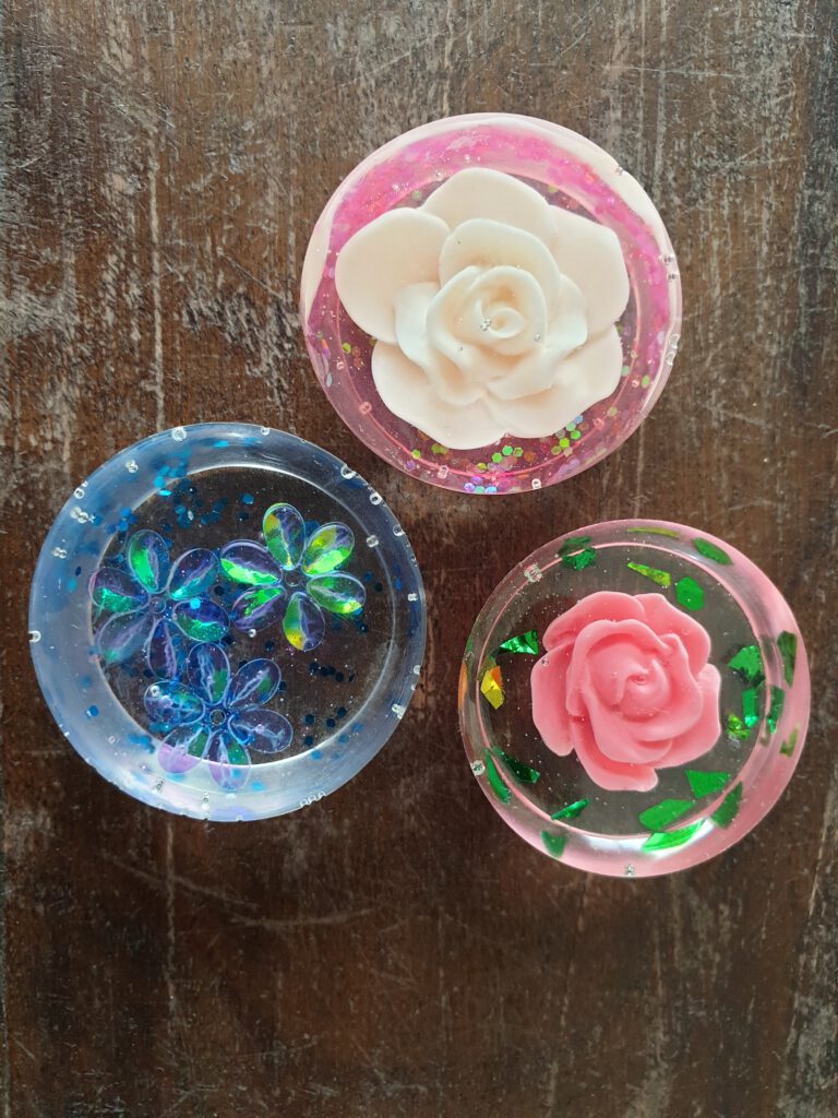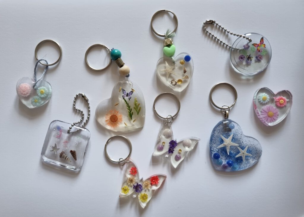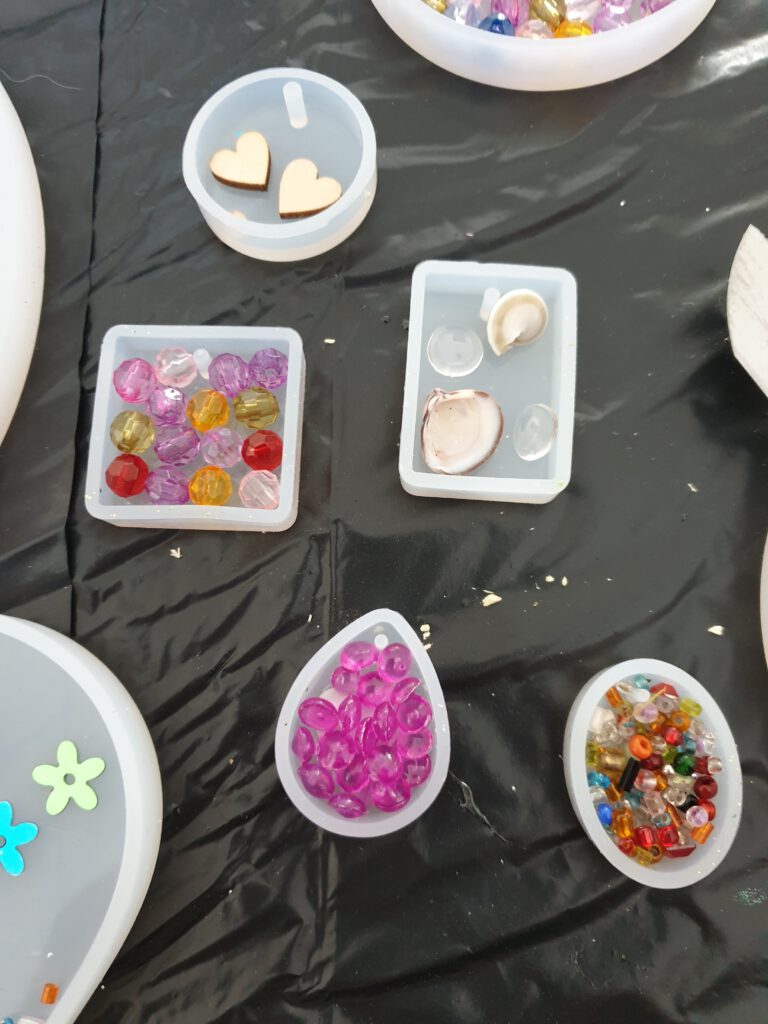 Met UV-epoxy bouw je laagje voor laagje je hanger op. Er is een keur aan mallen in verschillende vormen: zolang de epoxy vloeibaar is, kun je er van alles in leggen: glitters, edelsteentjes, schelpjes, gedroogde bloemetjes en zelfs as.