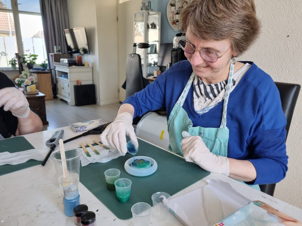 De epoxy bestaat uit twee delen, mengen we deze in de juiste hoeveelheden goed door elkaar, dan hardt de epoxy langzaam uit. Eventueel kun je de epoxy voordat je gaat gieten ook een kleur geven.