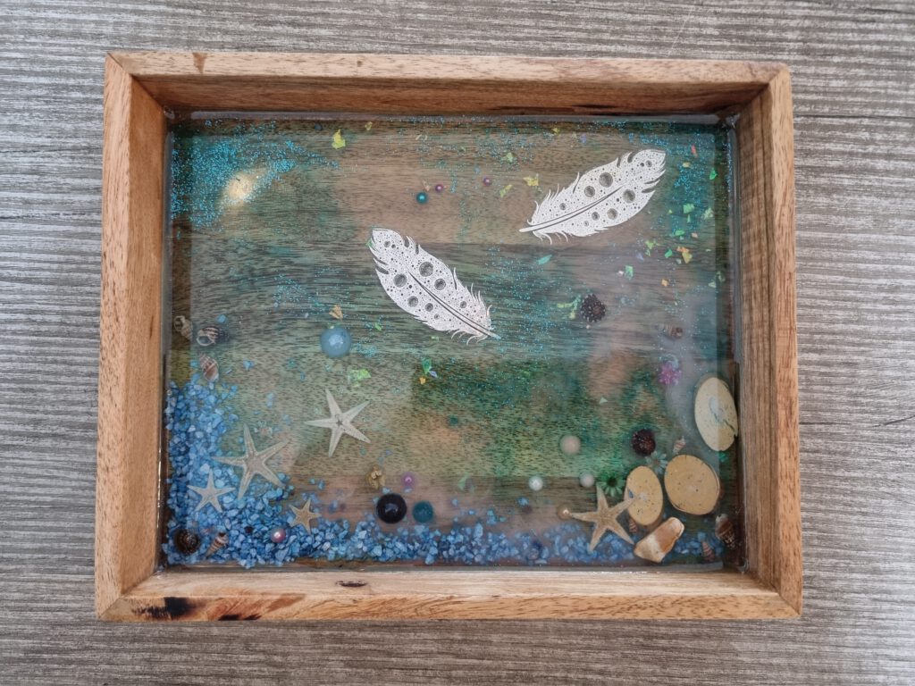 - Met verschillende materialen: steentjes, bloemetjes, schelpen, vlindertjes, glitters e.d. bouw je jouw ‘schilderijtje’ op. Met behulp van UV epoxy plak je jouw voorwerpen vast op de bodem. Eventueel kun je met UV-epoxy ook wat kleur toevoegen aan je schilderij. Ben je tevreden, dan giet je er een laag epoxy over totdat alles afgedekt is.